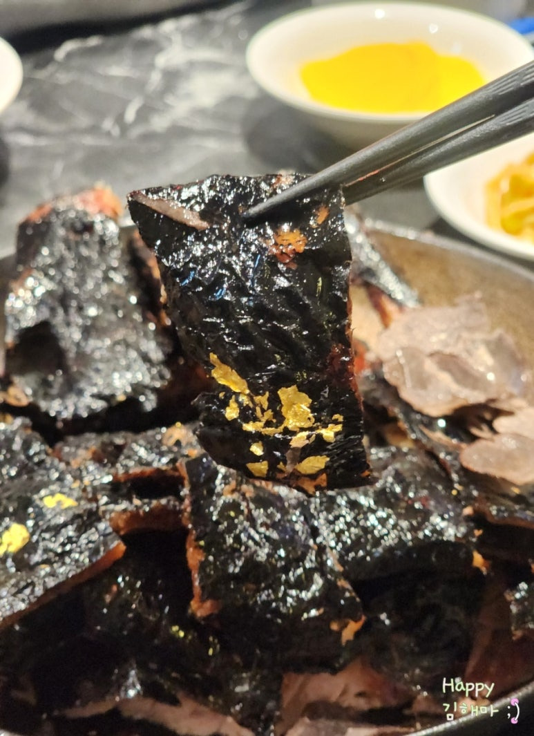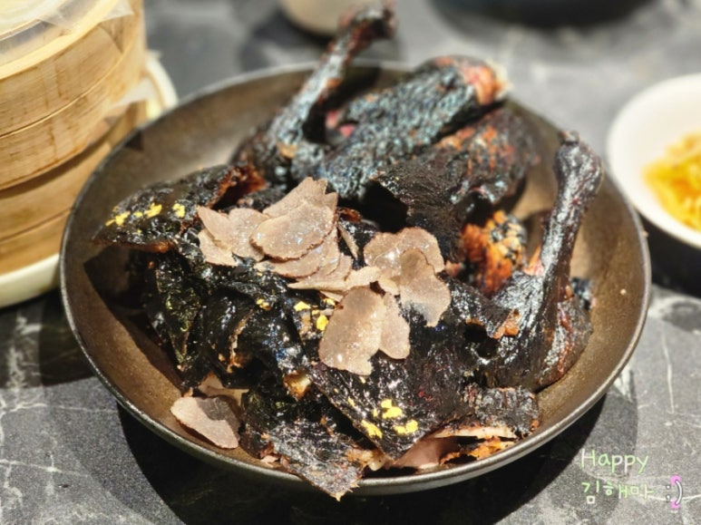먼저 껍질만 한 점 먹어보니, 짭짤한 감칠맛에 트러플 향이 더해져 정말 인상적인 맛이었습니다.