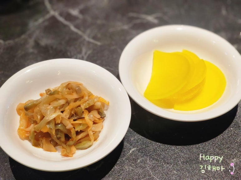 자리에 앉으면 기본 반찬으로 단무지와 짜차이가 먼저 세팅됩니다.
