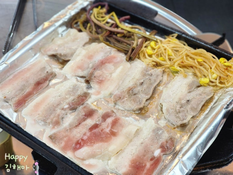 주문하자마자 반찬을 푸짐하게 내어주시고, 이어서 냉동삼겹살이 나왔습니다.
