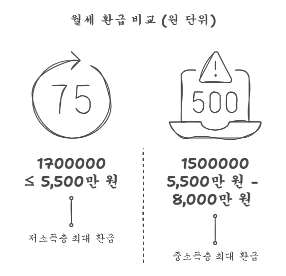 - 연간 월세 1,000만 원 × 17% = 최대 170만 원 환급